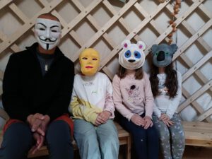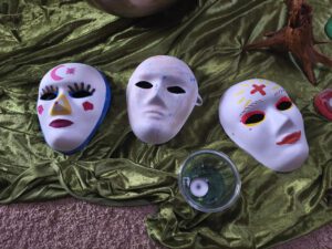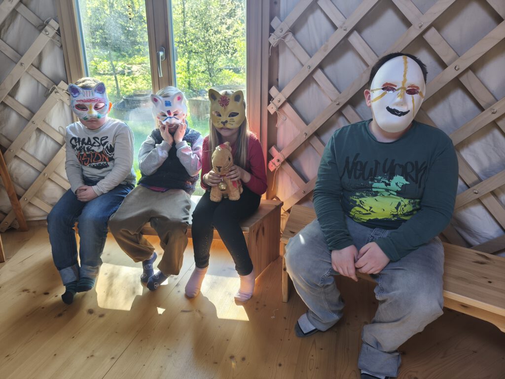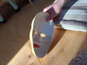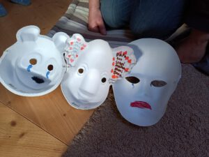 In den letzten Gruppenstunden haben wir uns daher gefragt, welche Masken wir tragen. In der Schule, im Freundeskreis, in der Familie, wo wir versuchen stark zu sein damit sich die übrigen Hinterbliebenen nicht noch mehr Sorgen machen. So haben die Kinder und Jugendlichen schöne Masken gestaltet, die nach außen hin bunt und fröhlich sind. Doch wie sieht es hinter der Maske aus: Auf die Innenseiten der Masken waren ganz viele Tränen gemalt, ganz viel Dunkel bis hin zu Schwarz. Nur eine war innen grün ausgemalt. Grün? „Ja, Grün“, meinte die kleine Künstlerin und ergänzte: „Das ist Kotzgrün – genauso, wie ich mich manchmal hinter meiner Maske fühle!“